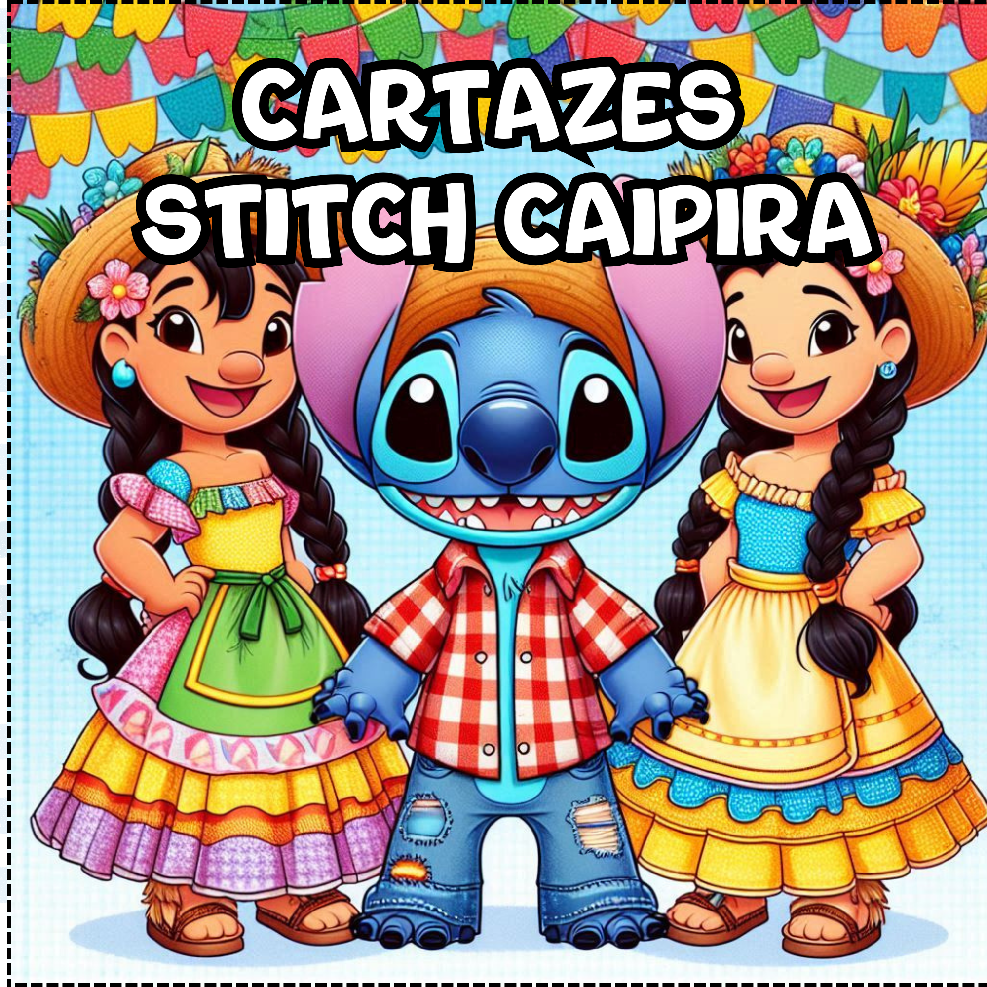 São 6 modelos de cartazes, todos com ilustrações exclusivas, coloridas e super alegres! O Stitch aparece vestido de caipira, com camisa xadrez, calça rasgada e chapéu de palha, em cenas típicas de festa junina.